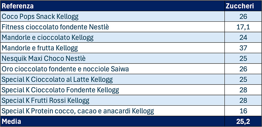 La tabella, riportata di seguito, relativamente ai valori nutrizionali, è un’elaborazione di UNIONE ITALIANA FOOD e contiene la quantità di zuccheri delle BARRETTE più vendute – che rappresentano il 42,8% delle vendite a volume di tale mercato (Fonte: CIRCANA, anno di riferimento 2024) – elencate in ordine alfabetico. Viene, infine, indicata la media dei valori nutritivi di tale elenco di prodotti e questa media viene presa come valore di riferimento per calcolare la percentuale di riduzione di zuccheri. Per maggiori informazioni: Unione Italiana Food | Claim Comparativi Cereali